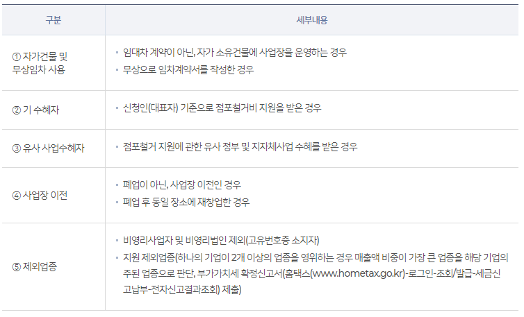 지원내용 : 점포철거 및 원상복구 비용의 250만원 한도 내에서 지원(부가세 제외)