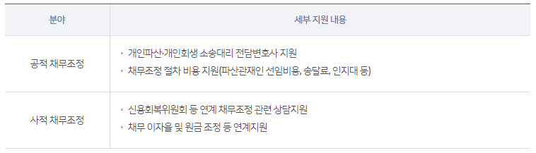지원분야 : 개인파산·개인회생 소송대리 및 신용회복위원회 등 연계를 통한 워크아웃
